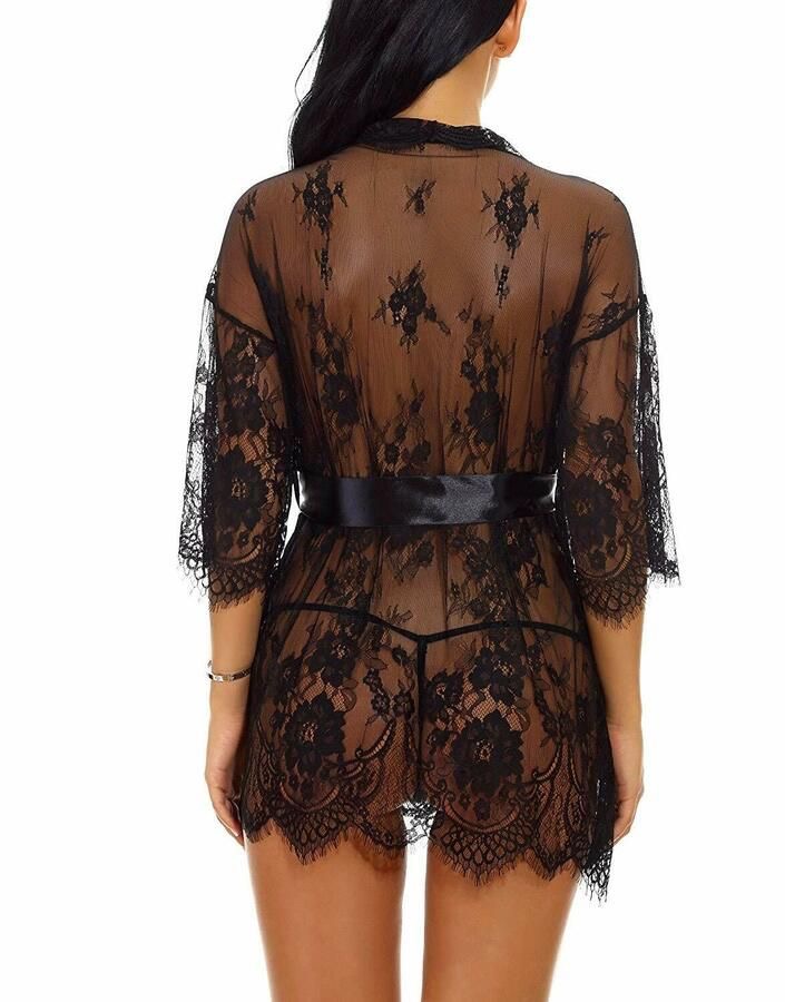 Bata sexy de encaje importada con cinta de raso para atar. Tiro corto y mangas 3/4.