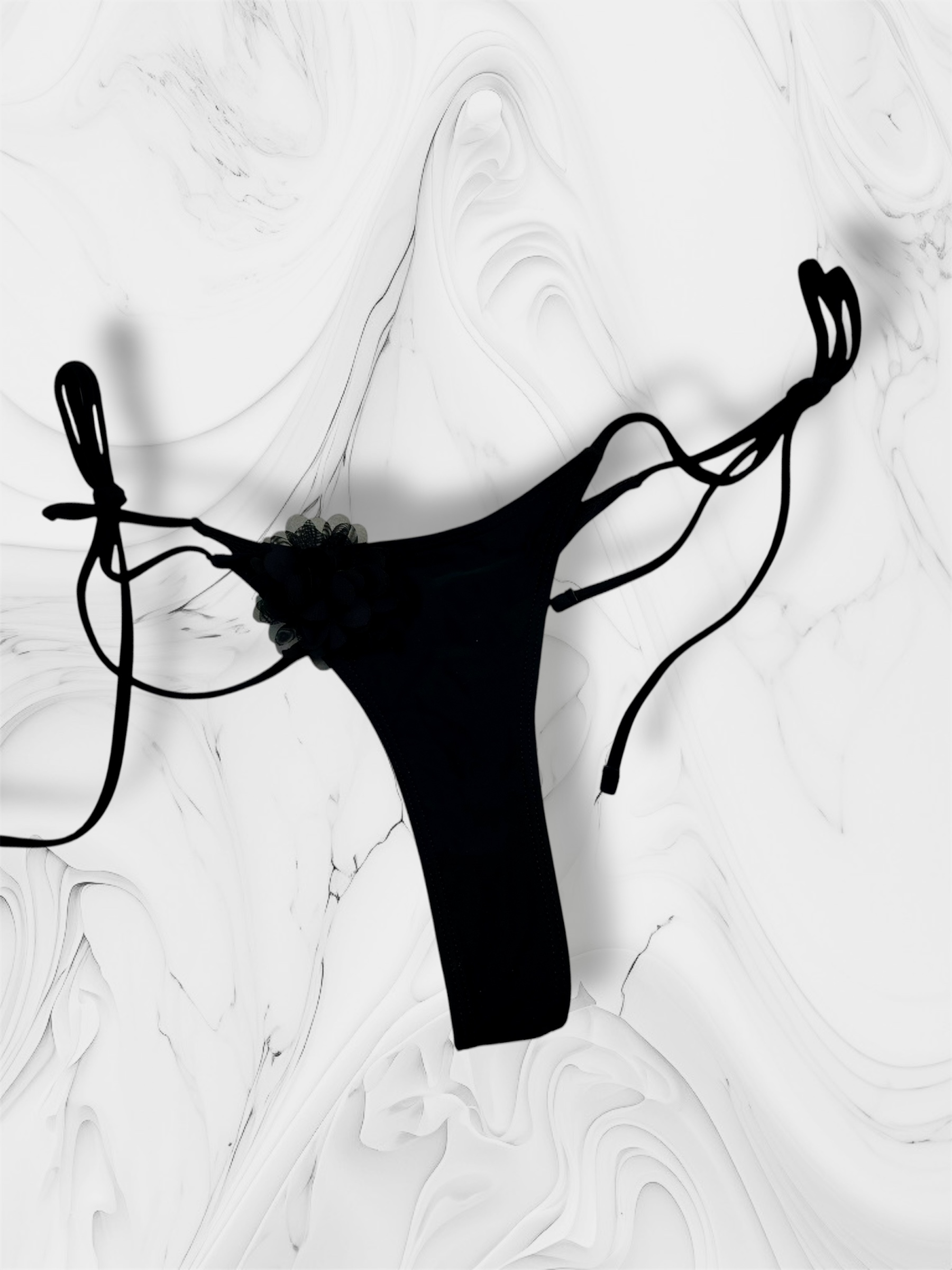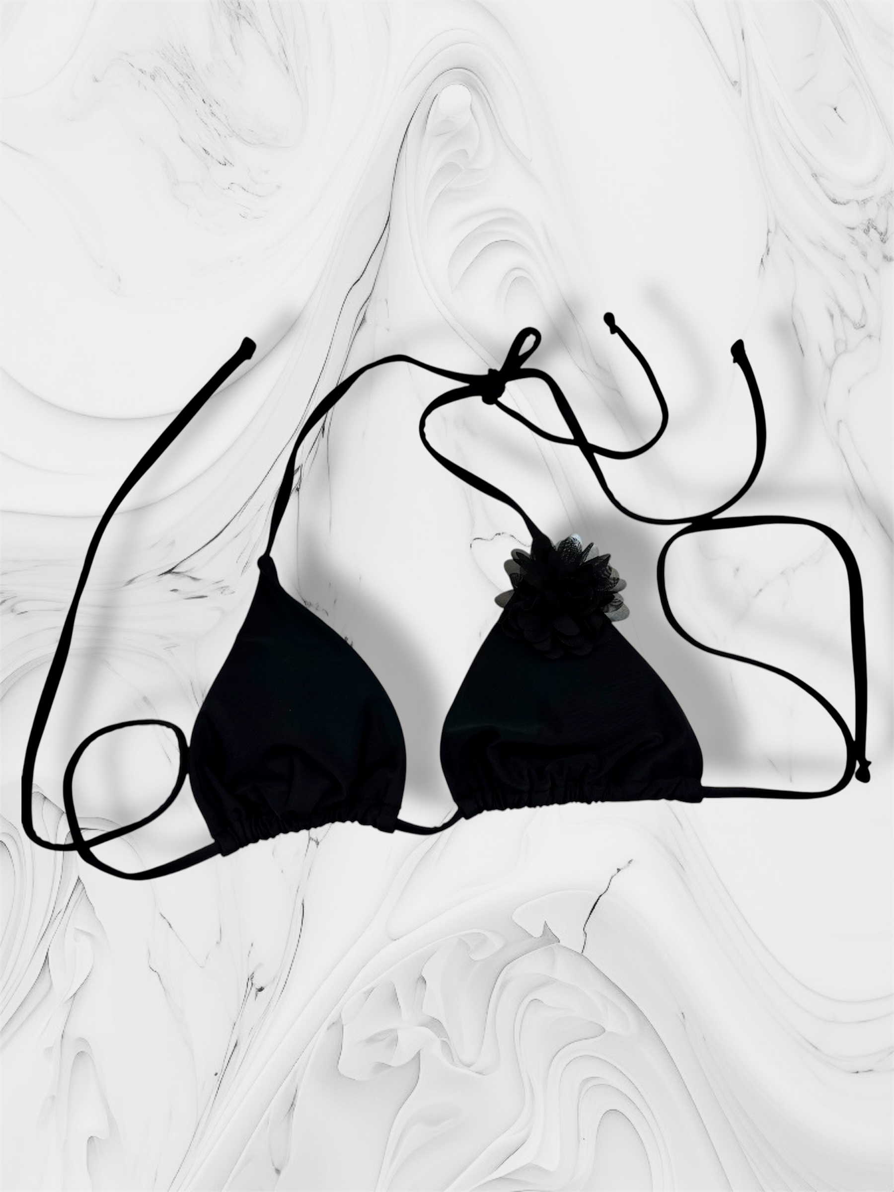 Bikini 2 piezas de lycra matte premium, con forro interno y detalle en flor de gasa. Parte superior corte triángulo soft desmontable. Parte inferior tanga colaless para atar corte tiro medio efecto lifting de piernas y glúteos.