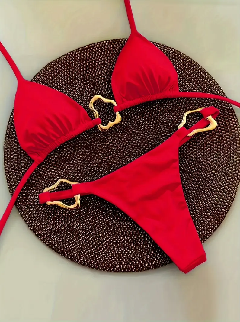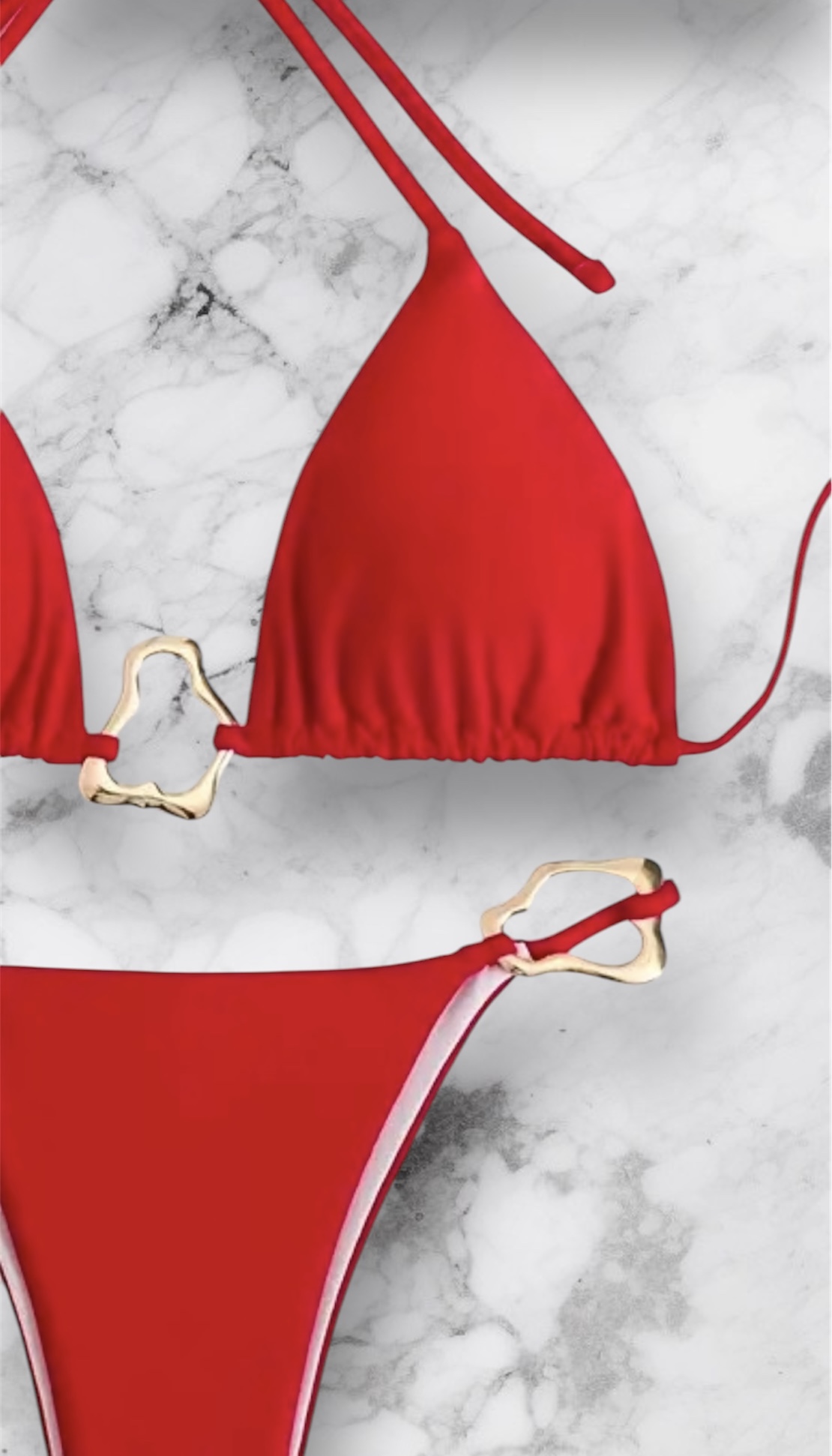 Bikini 2 piezas de lycra matte premium, con forro interno y detalles metálicos. Parte superior corte triángulo soft desmontable para atar. Parte inferior tanga corte tiro medio efecto lifting de piernas y glúteos.