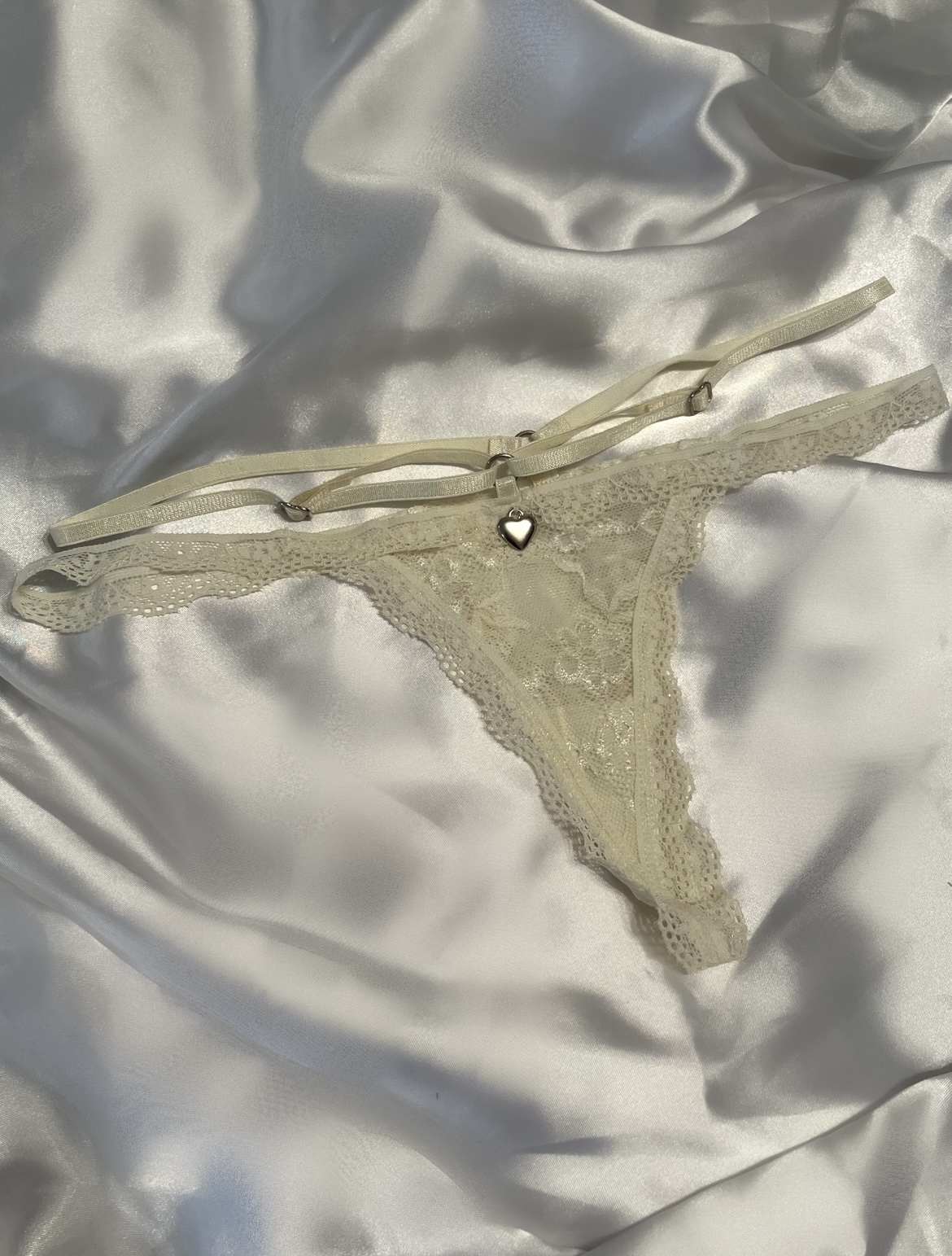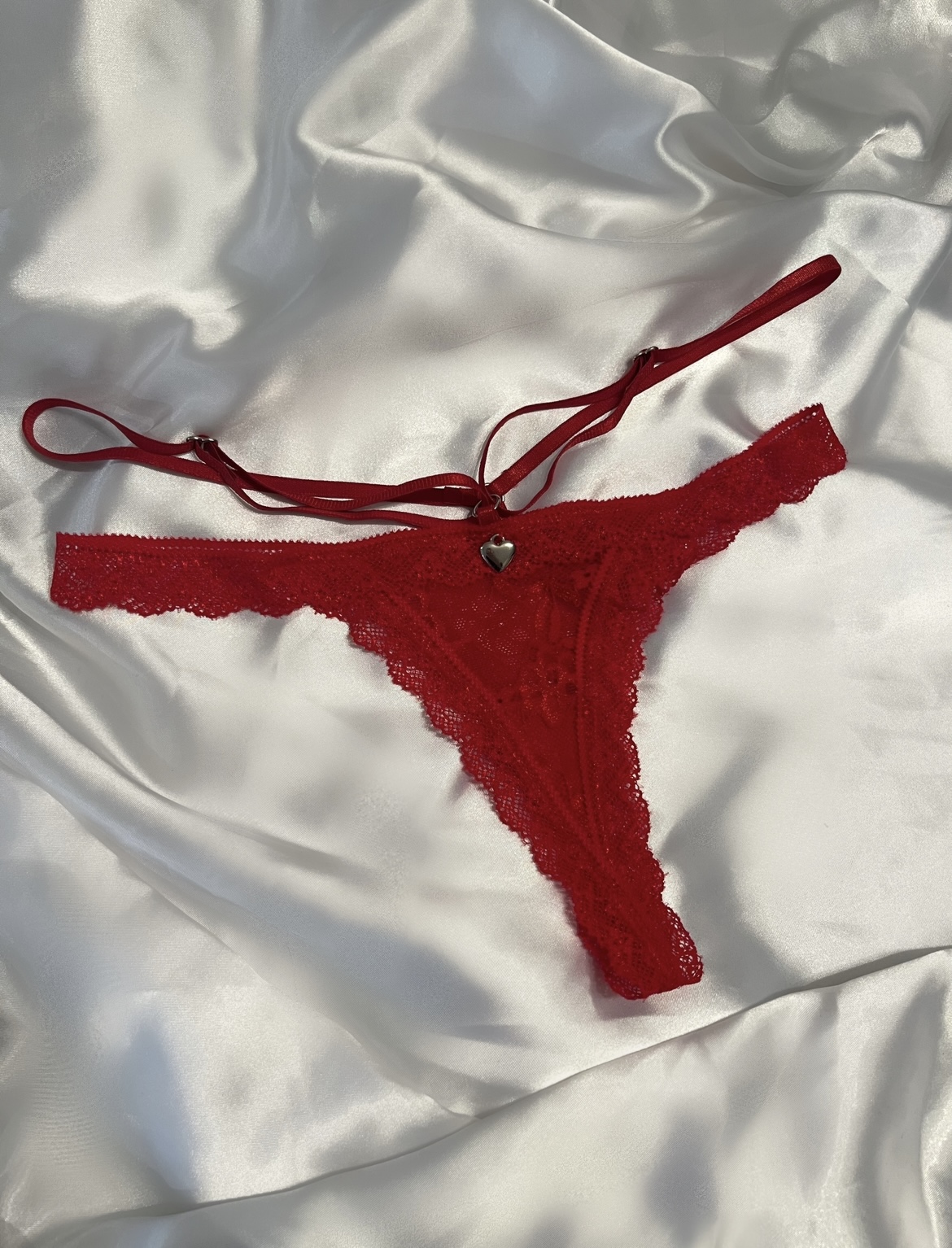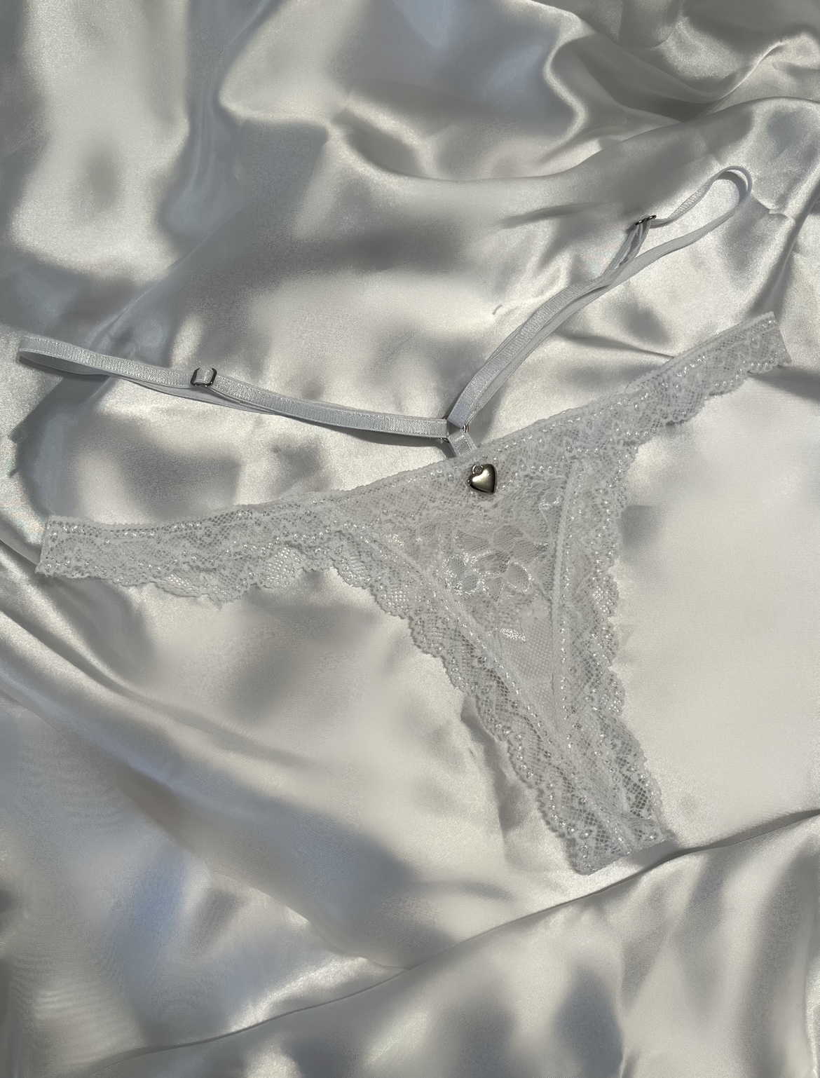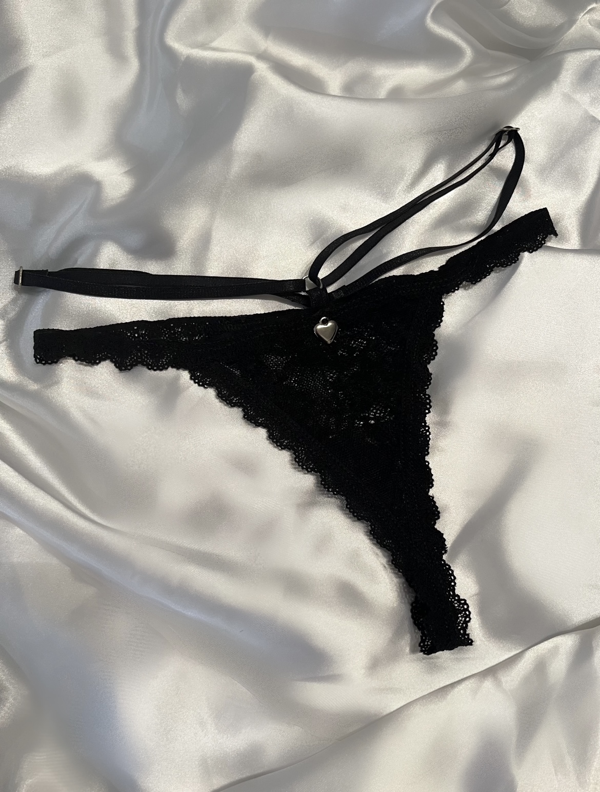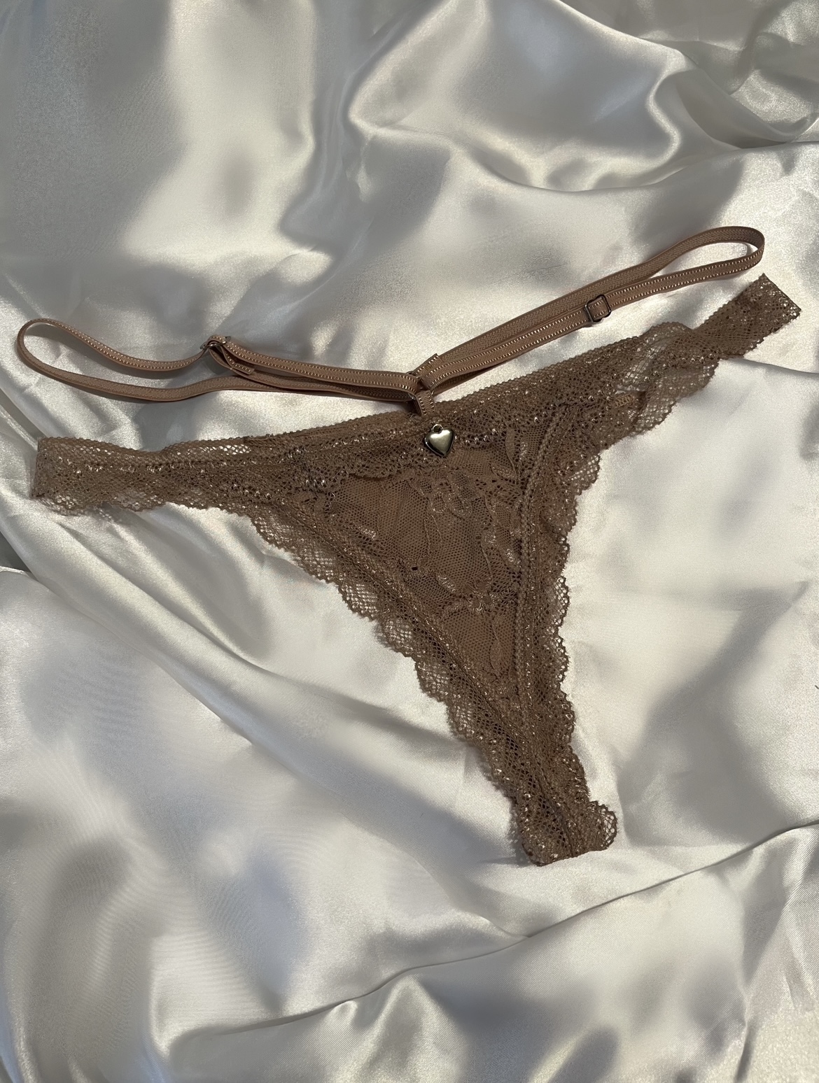 Tanga colaless de encaje soft, con doble tira regulable y detalle metálico.