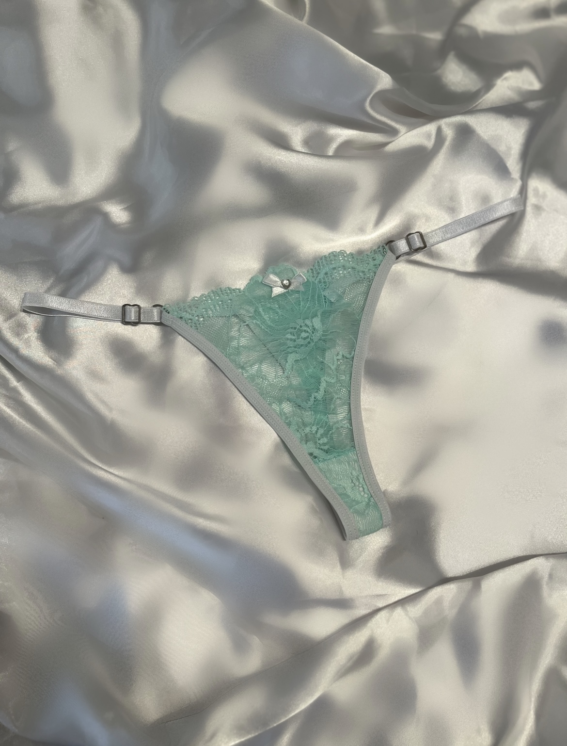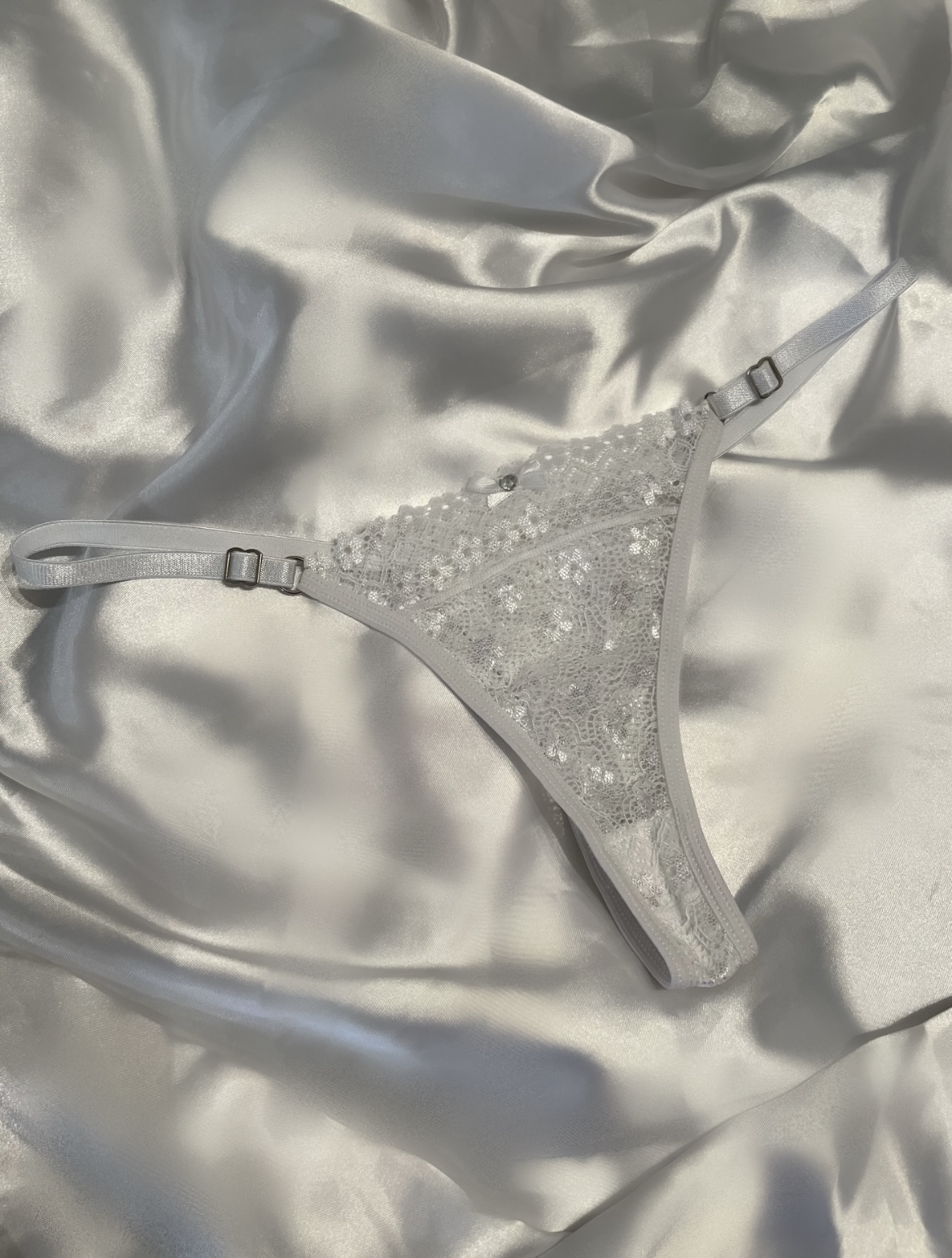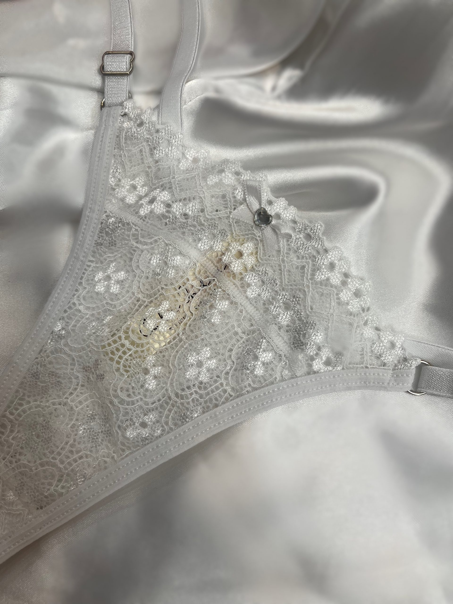 Tanga colaless de encaje con detalle de strass de vidrio con tira regulable.