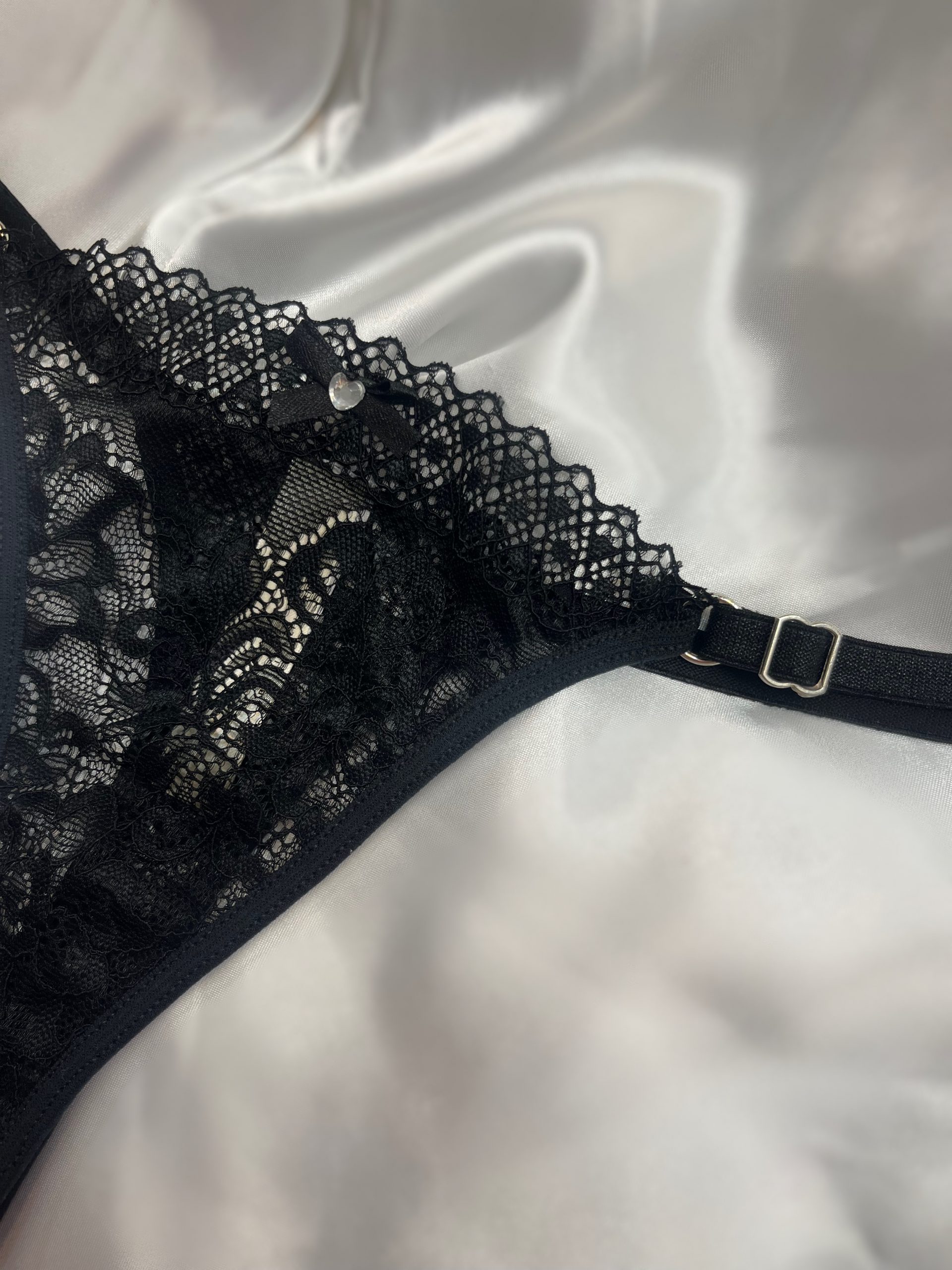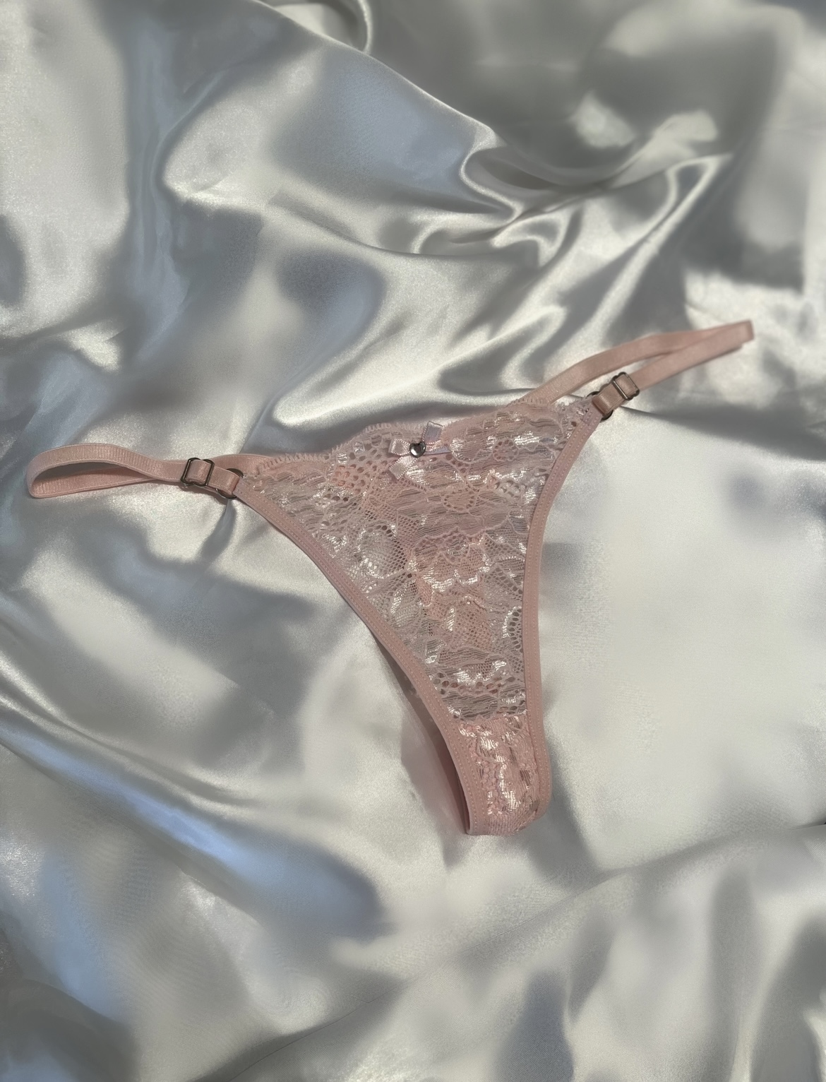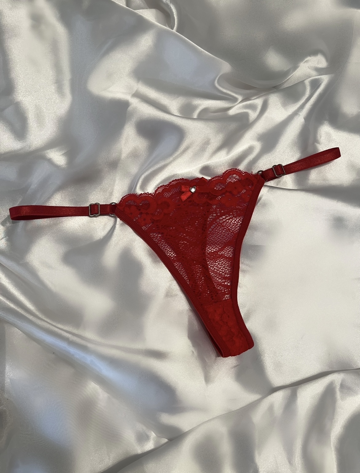 Tanga colaless de encaje con detalle de strass de vidrio con tira regulable.