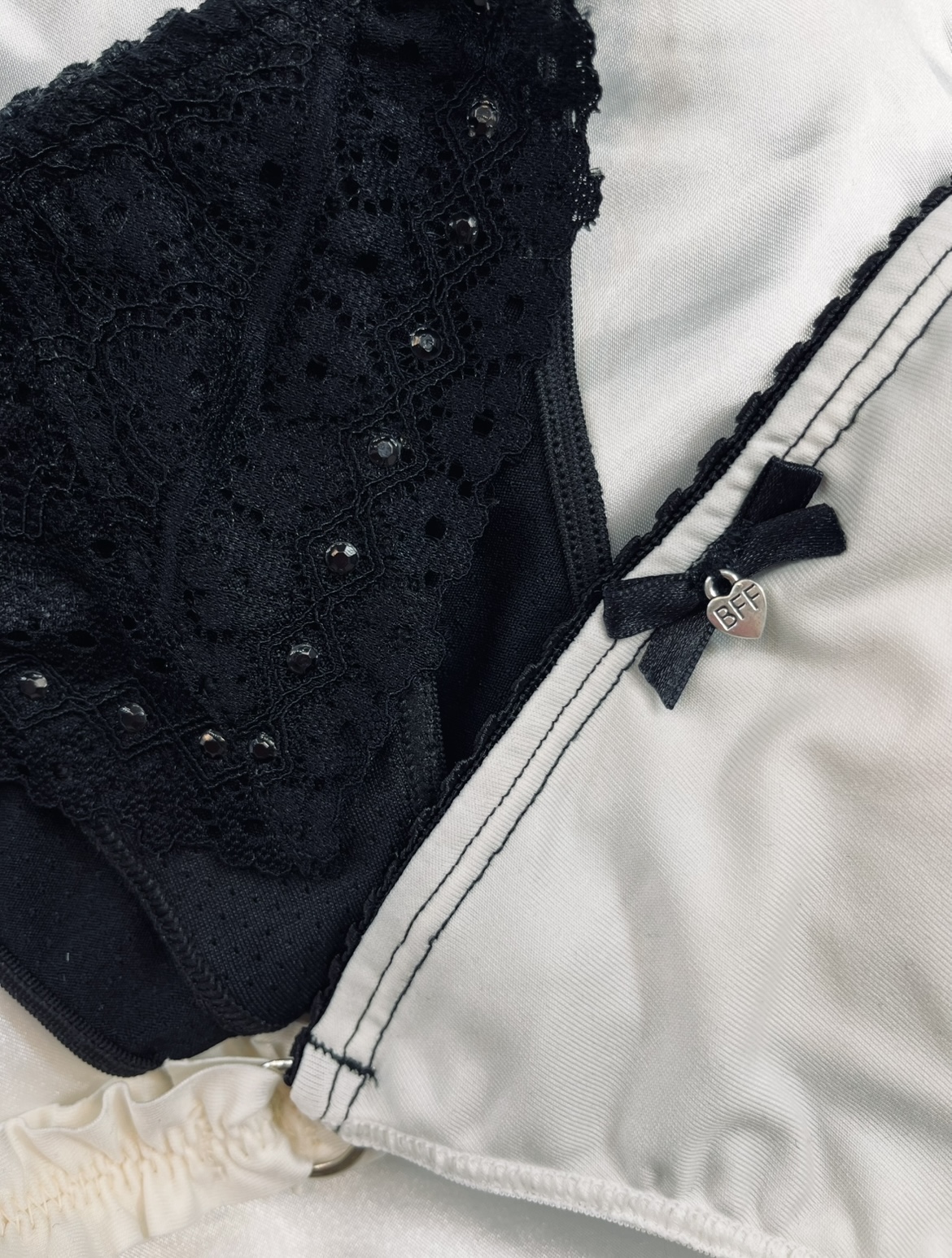 Tanga colaless de tira fru fru adaptable del S al L. Con detalle metálico al frente y detalle de puntilla con strass por detrás.