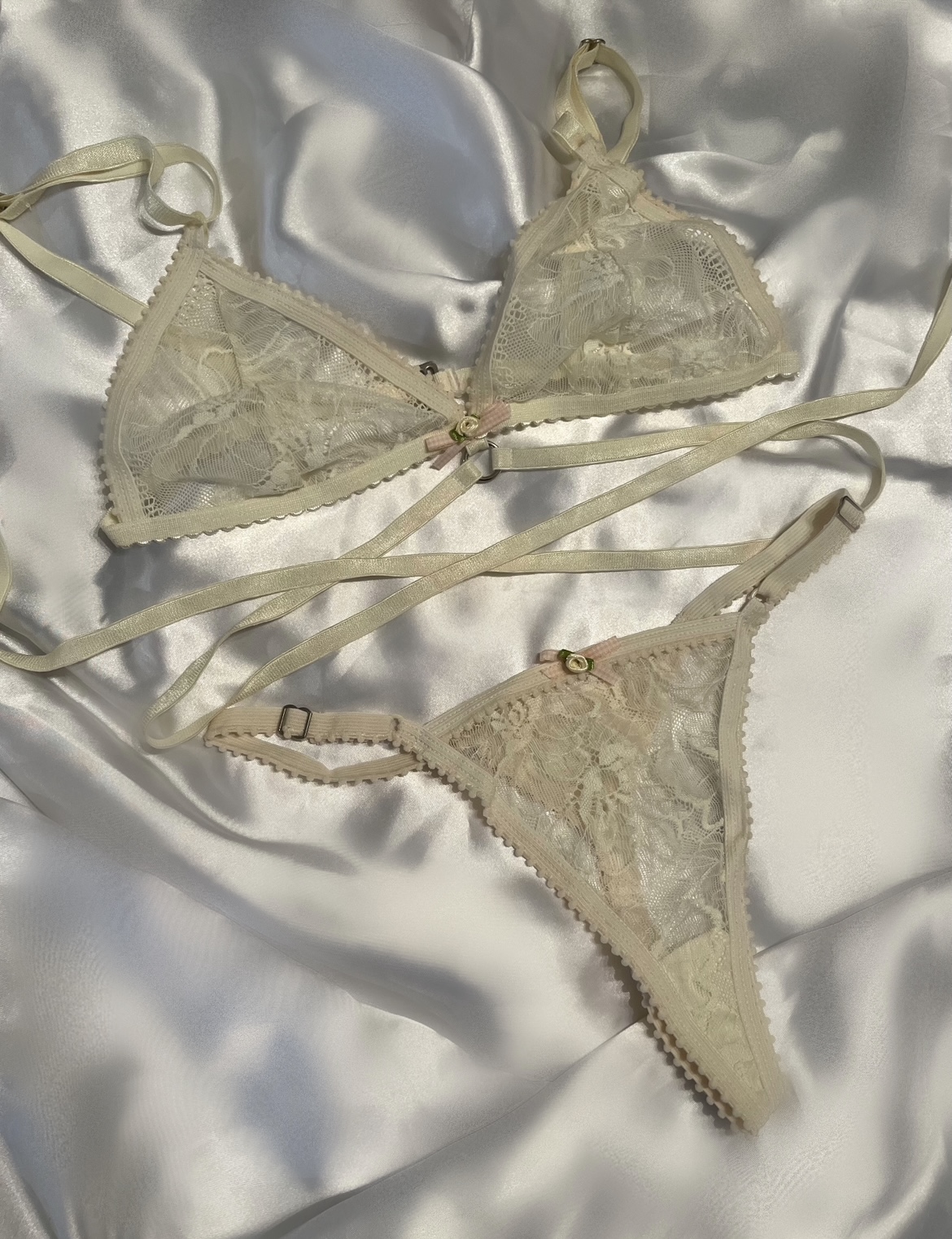 Conjunto de lencería de encaje. Parte superior corte triángulo con detalles rococó y arnés incluido Parte inferior tanga colaless de tira regulable.