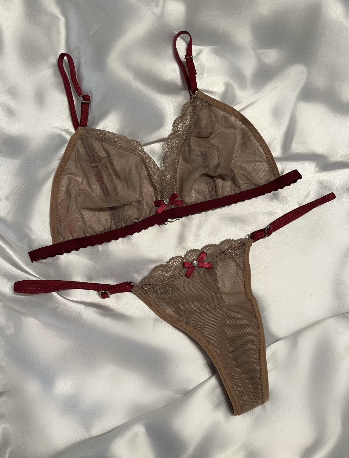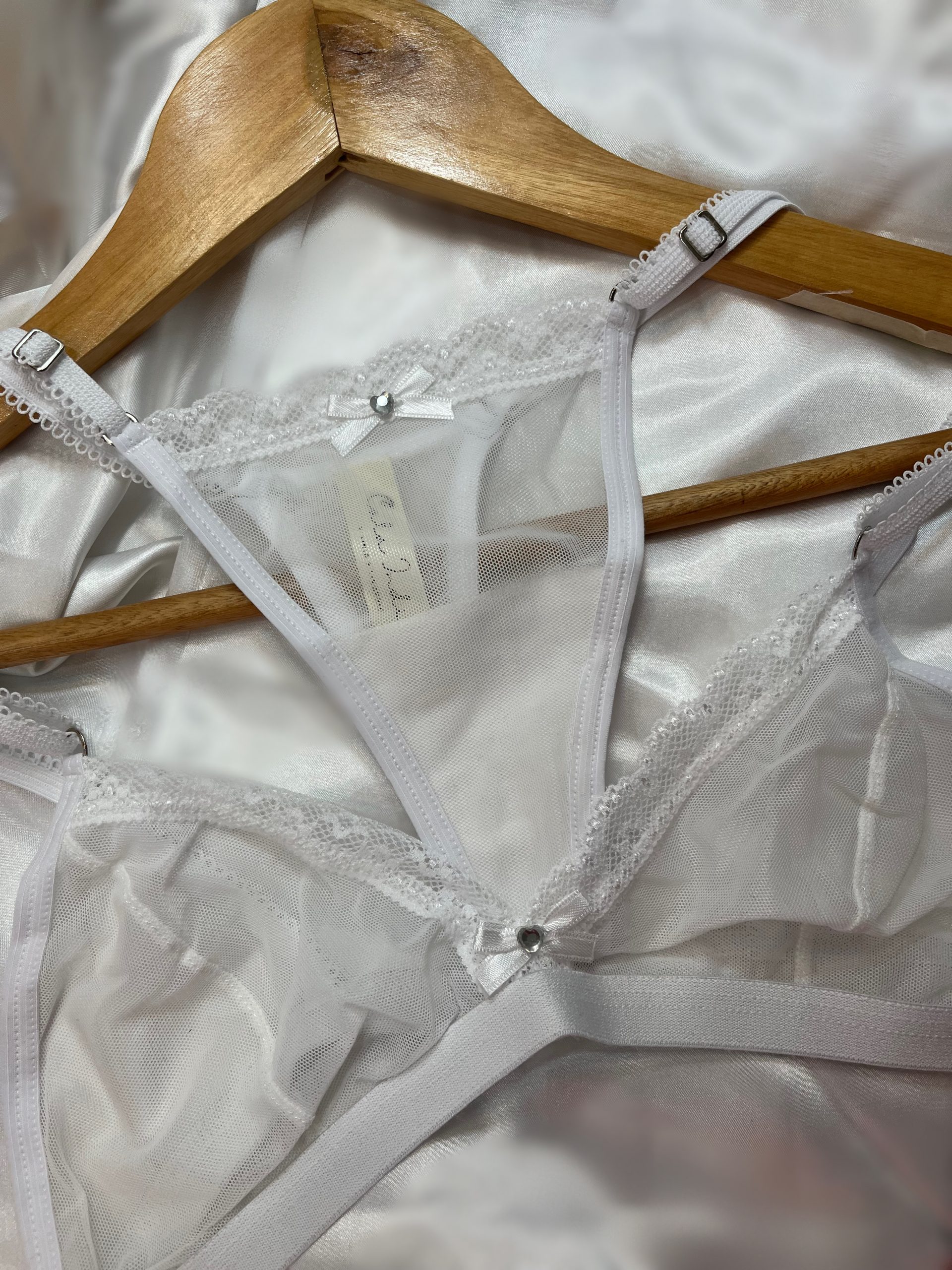 Conjunto de lencería de microtul con detalle en puntilla soft. Parte superior corte triángulo con detalles de strass de vidrio. Parte inferior tanga colaless de tira regulable.