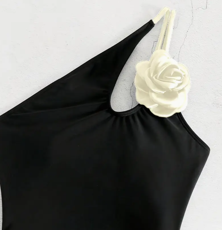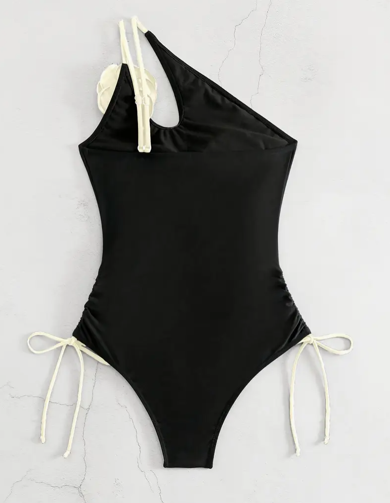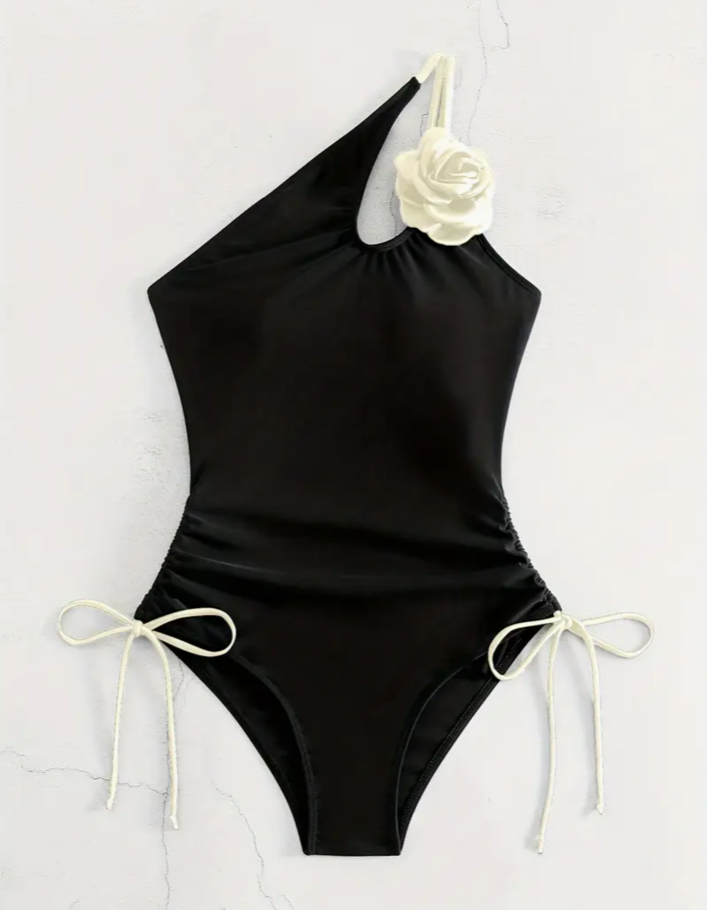 Enteriza de lycra premium, con forro interno. Parte superior soft un hombro con detalle flor de raso reforzado. Parte inferior vedetina con detalle de frunce regulable para elegir el cavado deseado.